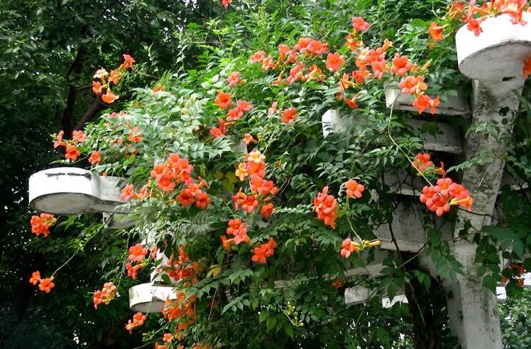 凌霄花是比较知名的观赏花卉,可以盆栽种植布置在阳台窗台等地方,点缀效果特别好,而且还可以与冬青、樱草放在一起,结成花束赠送给母亲,表达对母亲的热爱之情。除此之外凌霄花还有很好的药用功效与作用。