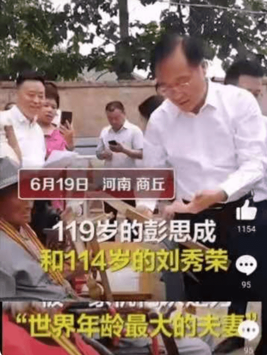 据沸点视频消息,6月19日,河南商丘。119岁的彭思成和114岁的刘秀荣被“扛旗世界纪录”认定为世界上年龄最大的夫妻”。在此之前,世界上年龄最大的夫妻是一对来自厄瓜多尔的夫妇,他们两人的年龄加起来有214岁。 据了解,“扛旗世界纪录”是来自英国伦敦,专门收录体育及非体育、赛事及非赛事、包罗所有的世界之最的世界纪录收录机构。宁陵县申报的“彭思成、刘秀荣是世界上年龄最大的夫妻”项目,经“扛旗世界纪录”初审委员会初步审核、讨论,意见基本一致后提交世界纪录认证委员会。最后,经多名世界纪录认证委员会的专家审核一致通过后,决定授予彭思成、刘秀荣是“世界上年龄最大的夫妻”。