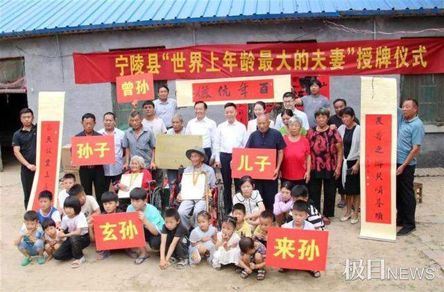 河南商丘宁陵县逻岗镇台马庄村有一对“世界上年龄最大夫妻”。两人年龄加起来233岁,结婚已有86年。全家有107口人,已是六世同堂。