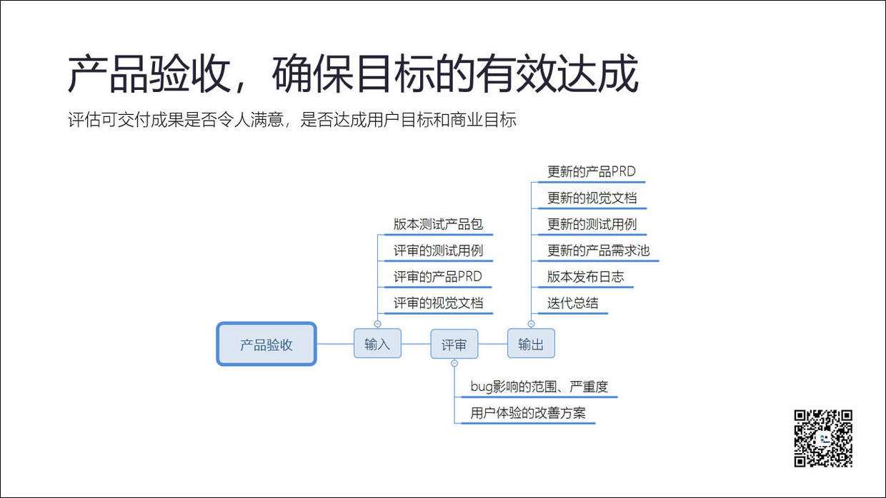 产品验收是为了最终交付而进行的成果验证和归档,包括收集项目完整的记录,确保产品满足用户和商业需求,并将相关文档进行归档,还包括项目的审计。