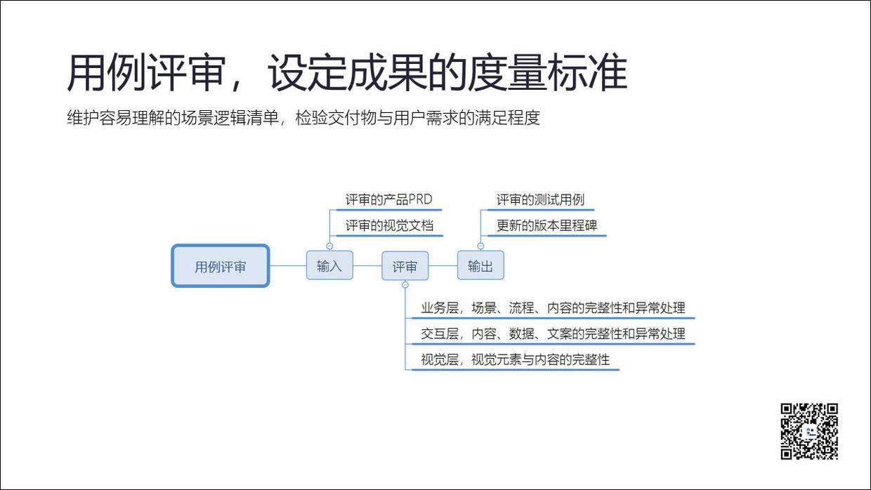 用例评审是针对产出成果设定其度量的标准,如何检验交付物与用户需求的满足程度。