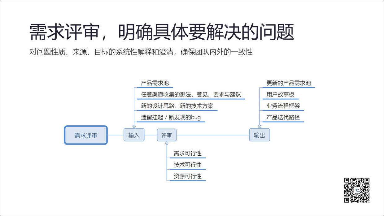 需求评审,是针对目前已收集的来自各个渠道的想法、意见、需求和建议等,通过恰当的工具进行汇总、梳理、分析和排序后,所最终得出的当下或未来需要完成的产品工作。