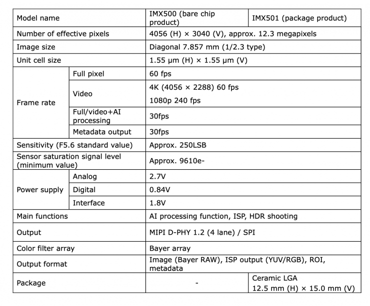 图 | IMX500 和 IMX501 的详细参数(来源:索尼)