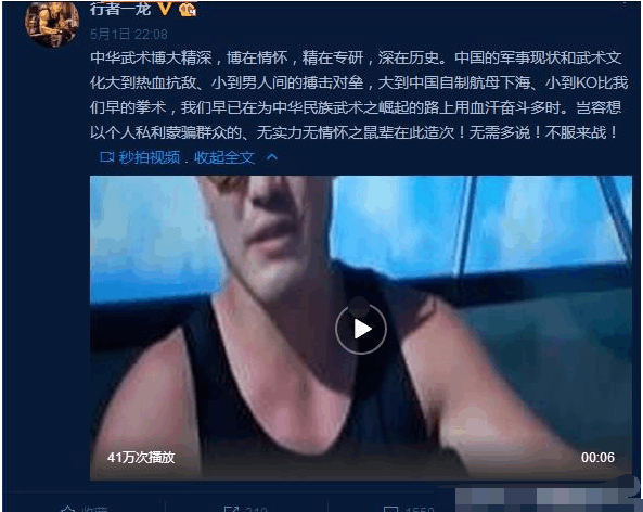 不过,可能是徐晓东兴奋的过了头,这几天他又接连向一龙、马云的保镖等人下了战书,甚至叫板奥运拳击冠军邹市明。其中,一龙在微博中似乎答应了徐晓东的约战,他在微博中写道:“中华武术博大精深,博在情怀,精在专研,深在历史。中国的军事现状和武术文化大到热血抗敌、小到男人间的搏击对垒,大到中国自制航母下海、小到KO比我们早的拳术,我们早已在为中华民族武术之崛起的路上用血汗奋斗多时。岂容想以个人私利蒙骗群众的、无实力无情怀之鼠辈在此造次!无需多说!不服来战!”虽然没有指名道姓,但我们都能看出来这里说的无实力无情怀、无胆鼠辈就指的是徐晓东了。不过一龙能够应战,倒也出乎大家的意料。作为观众,我们更期待这场充满争议的对决。
