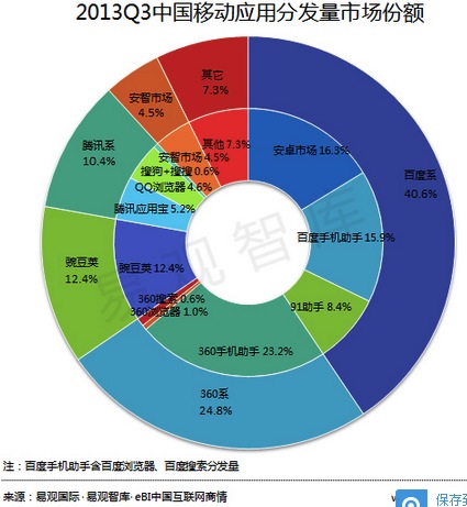 目前移动应用分发市场的前三位依次是“百度系”(安卓市场+百度手机助手+91助手)、“360系”(360手机助手+360浏览器+360搜索)和豌豆荚,市场份额依次为40.6%、24.8%和12.4%。而紧随“腾讯系”后,排名第五的是安智市场,份额为4.5%。